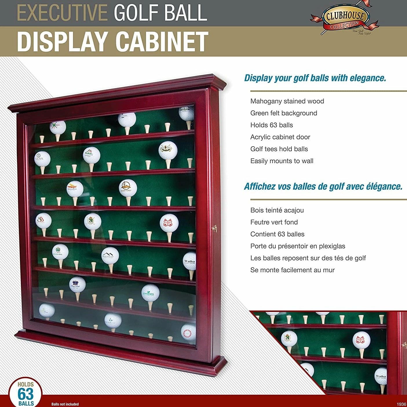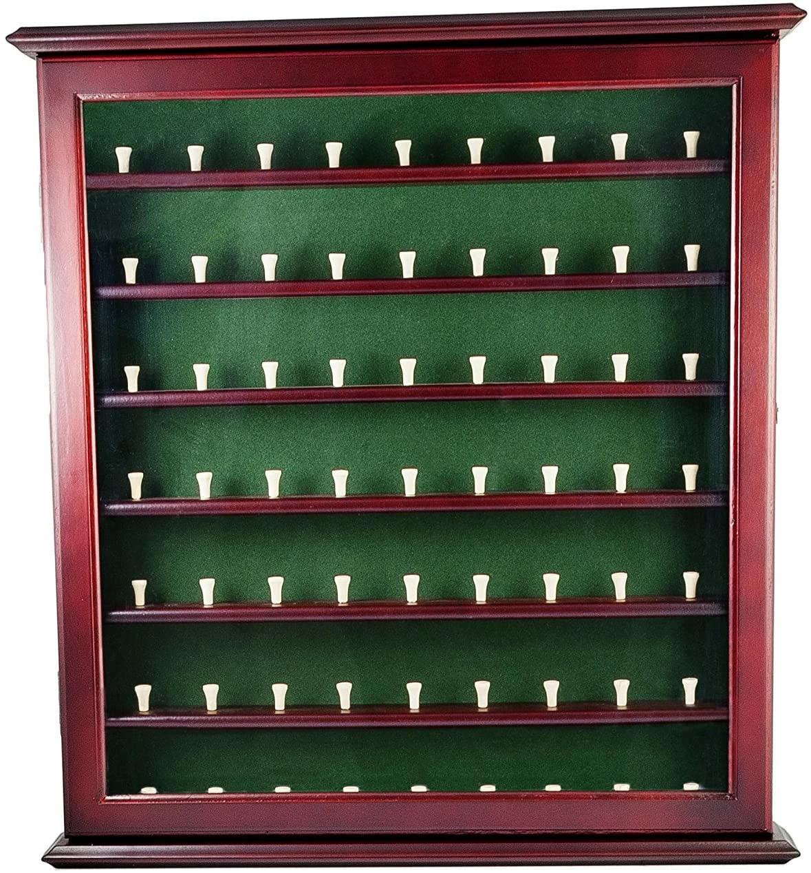 Display your golf ball collection proudly with the Clubhouse Collection 63 Ball Cabinet. Constructed of high quality mahogany finished wood with a simple, green felt background, the cabinet mounts easily on the wall. Each ball is displayed on a tee and is easy to view through the latching clear acrylic door. A brass golf emblem decorates the center, top of the cabinet.