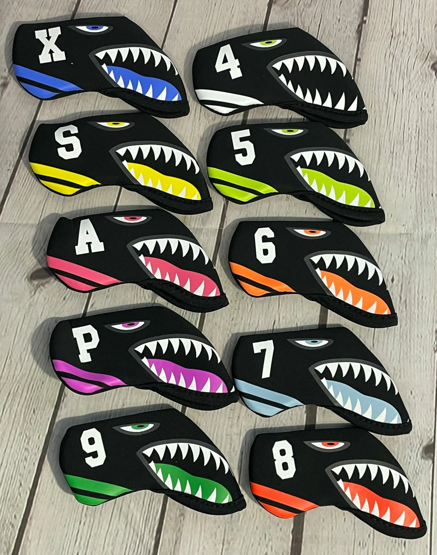 Protect your investment with these fun, colorful shark headcovers. 10 different individually labeled covers, each with a unique color, will make identifying the correct club quick and easy as well.